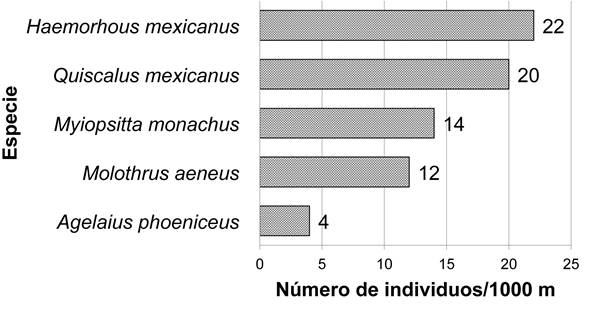 Los trabajadores del Campus indicaron cuáles aves son perjudiciales para la agricultura (Cuadro 2), mismas que, según ellos, siempre han estado presentes con poblaciones aparentemente estables, a excepción de las cotorras argentinas. Al respecto, algunos de los encuestados (17%) conjeturaron que hasta 80 cotorras habitaban el Campus. En contraste, los datos de abundancia por transectos revelaron que M. monachus no es la especie más abundante entre aquellas consideradas dañinas para los cultivos (Figura 7).