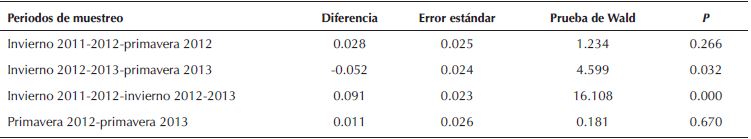 En ambos inviernos, la actividad de la chachalaca pálida comenzó más tarde que en las primaveras, debido a que en invierno amanece más tarde que en primavera, pero en todos los periodos de muestreo la actividad finalizó al mismo tiempo, antes de las 20:00 h (Figura 3). Los patrones de actividad del invierno 2011-2012 y de la primavera 2012 fueron similares (prueba de Wald = 1.234, P = 0.27), así como en ambas primaveras (prueba de Wald = 0.181, P = 0.67). En su lugar, hubo diferencias significativas (P < 0.05) cuando los periodos de muestreo se compararon entre el invierno 2012-2013 (Figura 3; Cuadro 1).
