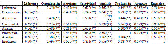 Finalmente, en la correlación de la dimensión Aventura con Liderazgo (r=0.567) y Aventura con Análisis (r=0.565), se puede observar que las personas con un interés hacia las ocupaciones que componen la dimensión Aventura, tienen afinidad hacia el Liderazgo y el Análisis. Asimismo, en las correlaciones de la dimensión Aventura con Creatividad (r=0.573) y Aventura con Erudición (r=0.577), se aprecia también que determinadas ocupaciones englobadas en la dimensión Aventura, requieren también Creatividad y Erudición.