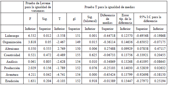 En la tabla 3 , se muestran los resultados obtenidos tras aplicar la prueba T-Student. En las dimensiones de intereses vocacionales se observaron diferencias significativas en cuanto a género en algunas dimensiones: Liderazgo (F=6.532; p=0.012), Organización (F=3.818; p=0.05) y Aventura (F=4.211; p=0.029). En el resto de dimensiones no hubo diferencias significativas: Creatividad (F=0.521; p=0.472), Análisis (F=0.061, p=0.805), Producción (F=2.029, p=0.156) y Erudición (F=1.631; p=0.204). En las dimensiones de Liderazgo, Organización y Aventura los hombres destacan frente a las mujeres según nos muestra la prueba de Levene para la igualdad de varianzas. Por el contrario, en la dimensión de Altruismo, el género femenino destaca con respecto al masculino, según la estadística descriptiva realizada en la tabla 1 pero la diferencia no es significativa (F=0.350; p= 0.55).