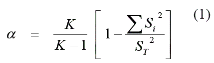 Dónde: α es el símbolo del alfa de Cronbach; K: el número de ítems; ΣS2i suma de las varianzas de cada ítem; y S2T la varianza total.