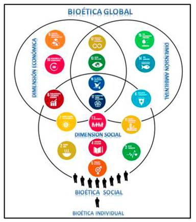 A su vez, la Agenda 2030 y sus 17 ODS representan una oportunidad para ampliar el campo de acción de la Bioética, llevando su espacio de reflexión desde la preocupación por el individuo y su entorno más cercano (Bioética individual), hacia la consideración del espacio social ampliado en que esa persona se mueve (Bioética social) y, en último término, hacia la apreciación del sujeto como parte de un todo ―complejo e interrelacionado― en el que interactúa, convive y se desarrolla en una relación simbiótica actual y futura, que exige la adopción de medidas de contención y protección ante los eventuales impactos que su acción genera (Bioética global).