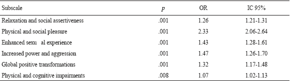 Subscales internal consistency was: relaxation and social assertiveness (11 items, KR-20= .84 [CI 95% .82.84]), physical and social pleasure (four items, KR-20= .67 [CI 95% .62-.71]), enhanced sexual experience (four items, KR-20=.71 [CI 95% .67-.75]), increased power and aggression (three items, KR-20= .71 [CI 95% .66-.75]), global positive transformations (seven items, KR-20= .70 [CI 95% .66-.74]) and physical and cognitive impairments (eight items, KR-20 = .75 [CI 95% .72-.78]).