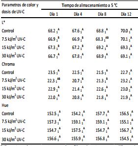 Capacidad antioxidante. Como se observó en la evolución del contenido de fenoles totales, la capacidad antioxidante total se mantuvo estable durante el almacenamiento y no fue significativamente afectada por los tratamientos con UV-C (Tabla 2). Esta correlación positiva entre el contenido de fenoles y la capacidad antioxidante ha sido reportada antes en otros productos tal como brócoli (Martínez-Hernández y col., 2011). Resultados similares fueron descritos por Jemni y col. (2014), quienes encontraron que la radiación UV-C estabilizó la actividad antioxidante total de los frutos de palma (cv Deglet Nour) durante el almacenamiento a 20o C.