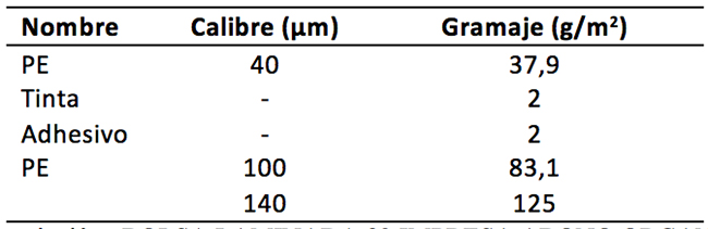 El empaque actual presenta un triple laminado incluido el foil de aluminio, capa de PET, Poliester, mismo que se puede observar en la tabla 2.