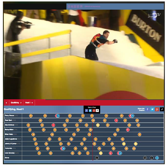 Por otra parte, desde la web, de inicio da la opción de compartir los contenidos a través de Facebook y Twitter y en la APP aparecen más posibilidades para compartir los contenidos (WhatsApp, Google +, etc.) Sin embargo, hay vídeos, que al ser reproducidos desde un ordenador, permiten publicarlo también en Google + o, incluso, dan la opción de copiar el enlace y compartirlo. En estos casos, la tecnología empleada genera una línea de tiempo en la que se destacan los hitos relevantes del vídeo a los que se puede acceder directamente y se pueden compartir (imagen 4)
