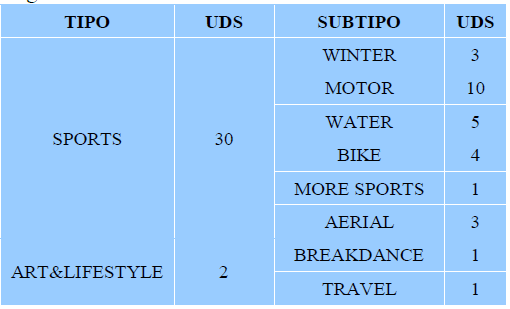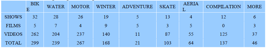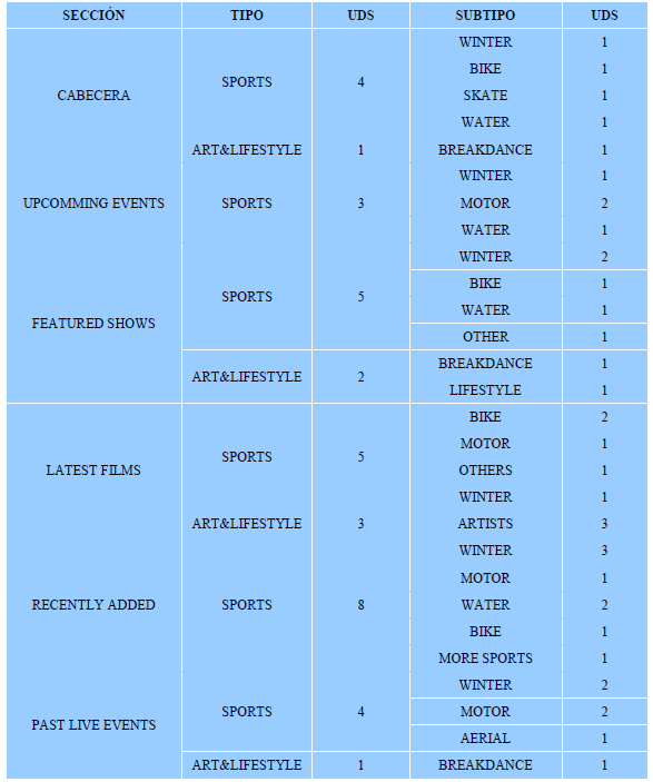 A continuación, desde los apartados 5.2.1 a 5.2.6 se indica en tablas el número de vídeos que hay en cada sección y subsecciones, dejando de lado los vínculos de About y RedBull.com que no disponen de este tipo de contenido. El análisis de contenido de la Home corresponde al día 20 de noviembre de 2015 dado que va variando y actualizándose constantemente. Así pues, se observan todos los contenidos que hay publicados hasta la fecha.