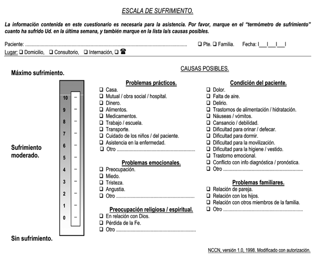 La investigación consistió en la evaluación del sufrimiento referido por los pacientes a través de una escala de medición cuantitativa. La evaluación se efectuó en dos entrevistas separadas temporalmente mediante la Escala de Medición del Sufrimiento procedente del Memorial Sloan Kettering Cancer Center 20 en Nueva York, publicada en el National Comprehensive Cancer Network21 -en su última versión del año 2013-, adaptada y validada oportunamente por la Fundación Médica de la Provincia de Buenos Aires 22. Dicha escala de medición clasifica el sufrimiento en máximo, moderado o sin sufrimiento, y detalla posibles causas del mismo, lo que permite a los pacientes seleccionar las que consideran más acertadas (ver figura 1).