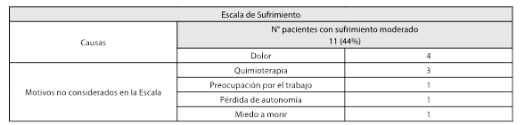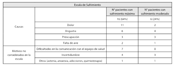 En esta segunda oportunidad se observó que los pacientes sin sufrimiento ascendieron a 14 (56 %); 11 (44 %) refirieron sufrimiento moderado, con el dolor como la principal causa (4 pacientes). No se registraron pacientes con sufrimiento máximo (tabla 2).