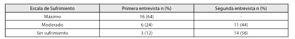 Con base en los datos recogidos en la primera entrevista se observó que 16 pacientes (64 %) manifestaron sufrimiento máximo -solo un paciente no especificó las causas de este-, 6 enfermos (24 %) sufrimiento moderado y 3 pacientes (12 %) ningún tipo de padecimiento (tabla 1).