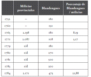 La cuestión racial introduce cierta especificidad para esta zona del imperio americano de los Borbones. En los últimos años, diversos trabajos han destacado la importancia de la participación de la población afrodescendiente en las milicias del rey. Según dichos estudios, la participación en las milicias de la población libre de color fue un instrumento utilizado por esta para mejorar su posicionamiento social, pero lo hacían en compañías segregadas de pardos y morenos (Belmonte; Vimson III). En el caso de los Blandengues, sin abandonar completamente la injerencia de las diferencias raciales (de allí la preocupación por anotar el “color” de la recluta), los pobladores con antepasados africanos se incorporaban a estas compañías en pie de igualdad a quienes presuntamente no los tenían.