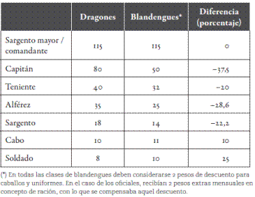Por un lado, los oficiales blandengues tenían una remuneración bastante menor a la de otras fuerzas de caballería y eran plenamente conscientes de la desventaja de su situación. En efecto, su prest estaba entre un quinto y un tercio por debajo del percibido por sus pares en el cuerpo de dragones. Y la diferencia llegaba a 37,5 % en el caso de los capitanes de compañías, discriminación que no sufrían ni el comandante del cuerpo ni la tropa.