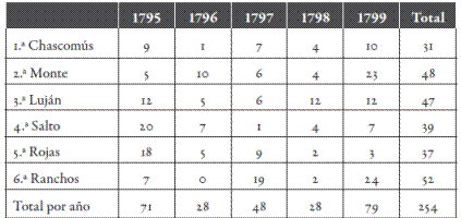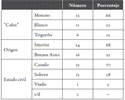 De una lista de filiaciones confeccionada en 1766 por el capitán de la compañía de Salto (la única con la que contamos para todo el periodo), se desprende que solo 11 sobre 50 efectivos podían acreditar la condición de blancos, 6 eran de color trigueño y 33 (dos tercios de la tropa) eran morenos. Es decir, si bien la presencia de población de color era importante en la campaña en general y en la frontera en particular, parece claro que estaban sobrerrepresentados en las filas blandengues. En efecto, si la población “de color” en la campaña apenas supera el 15 % de la población (Moreno 270), los soldados blandengues “de color” (trigueños y mulatos) rozan el 80 % de las filas. Por otro lado, de la misma lista de filiaciones se desprende que solo 16 soldados eran nativos de Buenos Aires, mientras que los 34 restantes (68 %) provenían de distintas partes del interior rioplatense9. Además, la gran mayoría (72 %) se encontraban casados o habían enviudado, proporción que aumenta en el caso de los migrantes.