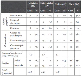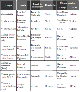 Como vimos, las reformas que introdujo Vértiz en las compañías de Blandengues incluyeron el nombramiento de una plana mayor y oficialidad veterana y peninsular, medida detrás de la cual no es difícil adivinar la intención de lograr un control político del cuerpo que le permitiera al virrey disponer de él según los objetivos bélicos imperiales. Al formularse como veterano, el Cuerpo de Blandengues ofreció la clase de “cadetes” para quienes quisieran incorporarse y hacer carrera en él. A partir de ese momento, las vacancias de oficiales se cubrieron mayoritariamente con jóvenes criollos de condición noble ingresados al Cuerpo de Blandengues desde esa clase. En efecto, de los once nuevos nombramientos producidos entre 1784 y 1800 para cargos de oficiales, nueve provenían de los cadetes del cuerpo y solo dos se habían desempeñado como suboficiales (significativamente, los únicos peninsulares).