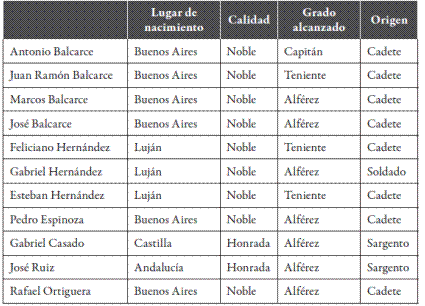 Además, existió una clara tendencia familiar, tanto para la incorporación de cadetes como en los nombramientos para cargos de oficiales. En particular, los comandantes estaban en posición de formar verdaderos clanes familiares dentro del Cuerpo de Blandengues. Francisco Balcarce, quien fue comandante del cuerpo entre 1786 y 1796, era oriundo de Barcelona, pero había formado familia en Buenos Aires al casarse con la patricia15 Victoria Damasia Martínez