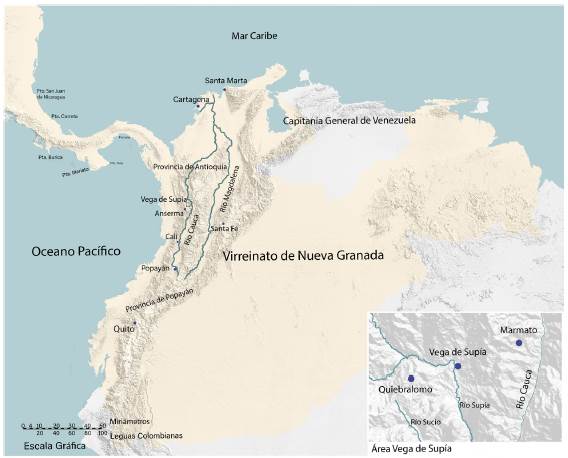 Situada en el costado noroccidental de la gobernación de Popayán, Anserma fue un área periférica y distante de los principales centros urbanos de Nueva Granada. Fue, al mismo tiempo, una región tempranamente colonizada debido a los ricos yacimientos minerales de Quiebralomo y Marmato, localizados en un área del extremo norte de la provincia conocida como la Vega de Supía (figura 1). El intenso trabajo en estas minas contribuyó al drástico declive de la población nativa en el área, que se redujo de 40.000 habitantes a la llegada de los españoles (1536-1539) a cerca de 10.000 en 1559, y a un estimado de entre 800 y 1.500 en la década de 15807.