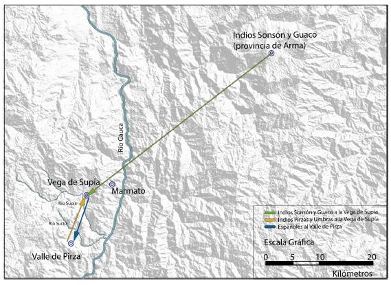 Según el testimonio de Marcos, indio del repartimiento de Pirza, tanto los de su pueblo como los indios de Supía la Baja y la Alta son todos "ladinos y hablan la lengua española" y de tiempo atrás mantenían comunicación y comercio. Por su parte, los indios de Sonsón también habían mantenido contacto con los de Anserma, pues entre sus nueve indios forasteros figuran naturales de los pueblos de Pirza y Opirama (AGN, se, ve, doc. 2, ff. 538 v-540 v.; doc. 16, ff. 914 r.-917 v.).
