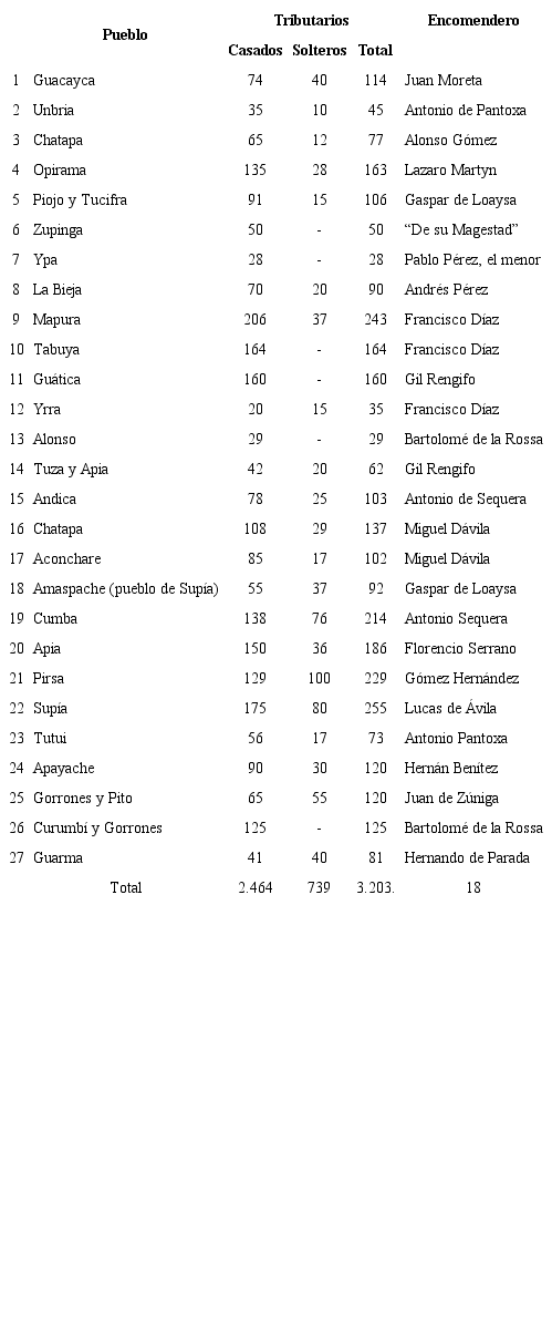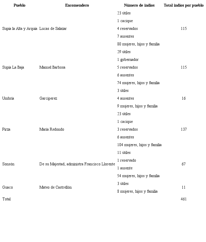 Los registros de esta visita no informan sobre los patrones de asentamiento indígena. Aunque se menciona el término pueblo, no es claro si, por ejemplo, al referirse a los indios del "pueblo de Supía" se alude a su adscripción tribal, o a un grupo de nativos confiados al mismo encomendero, o a quienes habitaban un determinado asentamiento. Esto último es dudoso si se tiene en cuenta que López Medel y Del Valle declararon no haber hecho la inspección "por vista de ojos", debido a las dificultades de acceso y la dispersión de la población nativa. Adicionalmente, las ordenanzas expedidas al culminar la visita se referían a la obligación de los encomenderos de congregar a los indios en pueblos y dotarlos de un cura doctrinero, lo cual sugiere que la creación de pueblos de indios en Anserma no se había completado para la época de esta inspección. Es más probable que para entonces el término pueblo denotara los nuevos conjuntos sociopolíticos resultantes del reparto de la población nativa en encomiendas, antes que una localidad o asentamiento indígena (Quiroga 183). En efecto, como se aprecia en la tabla 1, los indios Supía aparecen repartidos en dos "pueblos": Amaspache (pueblo de Supía), encomendado a Gaspar de Loaysa (n.° 18) y Supía, encomendado a Lucas de Ávila (n.° 22). En definitiva, la visita de 1559 confirma que fueron el tributo y el trabajo, más que la tierra, los aspectos que concitaron la atención de las autoridades coloniales durante el primer ciclo de visitas.