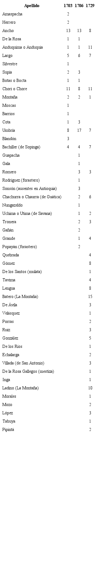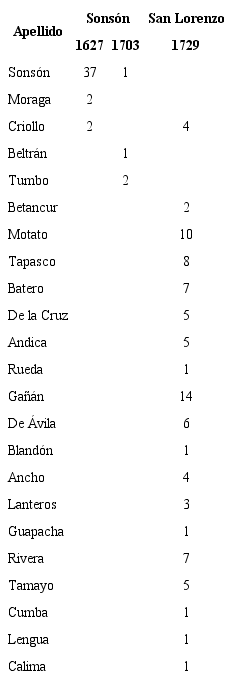 La primera numeración del pueblo de San Lorenzo de que se tiene noticia data de 1729. Consta de un total 87 personas cuyos apellidos también aparecen en las listas censales de otros partidos de la zona. La única coincidencia entre la lista de naturales de Sonsón de 1627 y la de San Lorenzo en 1729 es el apellido Criollo (tabla 4). Para 1729 el apellido Sonsón tan solo figura en dos indios listados en el partido de Cañamomo, que son registrados como oriundos de Mariquita (tabla 5). Esto desvirtúa la tesis de la continuidad entre los pueblos de Sonsón y San Lorenzo. Un documento presentado en i758 por los indios de Cañamomo dentro del pleito con los supías sugiere una hipótesis alternativa, al señalar que la parcialidad de Supía la Alta "se mantiene hoy con el título de San Lorenzo" (AGN, se, R, doc. 25, f. 619 r.). Aunque la evidencia analizada no es suficiente para reconstruir la génesis del pueblo de San Lorenzo, ella sugiere que pudo resultar de la agrupación entre varias familias indígenas de distintos partidos, incluidos los de la encomienda de Supía la Alta.