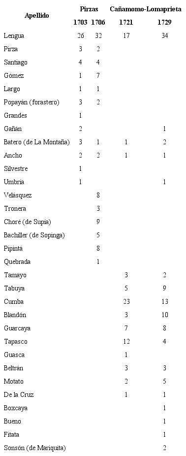 Sin embargo, en la numeración hecha el mismo año, un total de seis de las veinte familias del partido de Pirza censadas como presentes figuran como residentes en Lomaprieta11. En 1706, algunas de estas familias aparecen como residentes en Quiebralomo. Esto sugiere un paulatino desplazamiento de los pirzas desde el pueblo de San Lesmes de Supía hacia el sitio de Lomaprieta y la doctrina de Quiebralomo, situados en dirección a su antiguo territorio en el valle de Pirza, desplazamiento que, como se explicará más adelante, se relaciona con la ocupación de las tierras del llano de Supía con ganados de españoles.