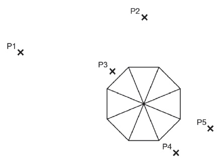 En la figura 3 se muestra la vista del tejado de la torre desde arriba. Se han señalado cinco posiciones en el dibujo. Cada una de ellas está marcada con una cruz (x)y se han denominado de Pi a P5.