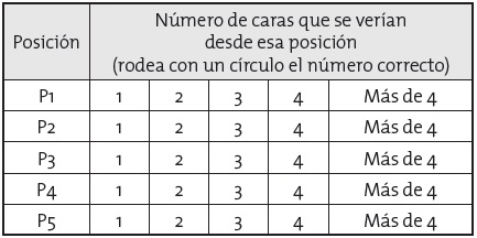 En la tabla siguiente, rodea con un círculo el número de caras que se verían desde cada una de estas posiciones.