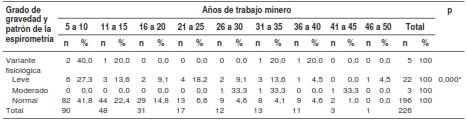 Hubo una asociación estadísticamente significativa (p<0,01) entre seriedad del patrón de la espirometría y los años dedicados a la minería, registrándose la mayor proporción de casos graves a partir de los 26 a 30 años de trabajo minero (cuadro 1).