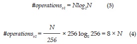 FFT algorithm executes operations, being N the number of samples to be used for the FFT and a power of 2. For the first version, the FFT algorithm is executed once, for a vector of size N. Thus, the formula will be as shown in equation 3. For the second version, the FFT algorithm will be executed N/256 times, but for signal plots of size 256 (around 30ms). Then, the amount of operations will be determined by the equation 4.