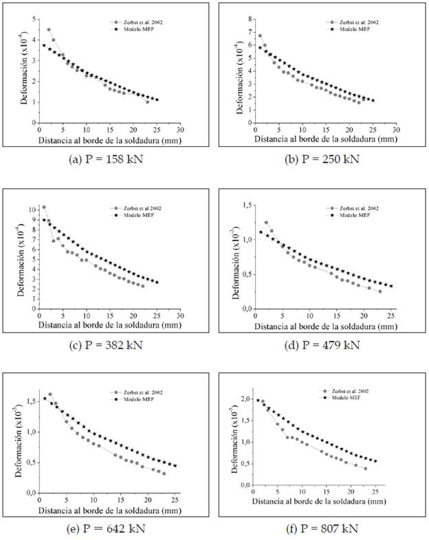 Se han registrado los resultados para seis diferentes cargas en el extremo libre de la unión en T para obtener la deformación en la zona crítica. La medición de dicha deformación se realiza empleando la distancia al borde de la soldadura x de acuerdo a lo indicado en las Figs. 10 (a)-(b). En las Figs. 11 (a)-(e) se muestran los resultados obtenidos para cada carga en contraste con valores obtenidos experimentalmente por Zerbst et al. [18].