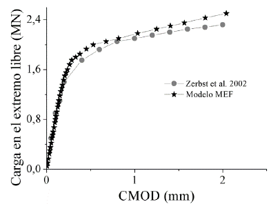 El desplazamiento de apertura de la boca de la grieta (CMOD) ha sido medido en el modelo MEF mediante el mismo método utilizado por Zerbst et al. [18], correspondiente al CMOD-Ô3, por lo que se ha medido la separación entre dos puntos ubicados a una distancia de 3 mm en forma equidistante a partir del borde del plano de separación en el punto central de la grieta. Los resultados obtenidos para el CMOD en función de la carga aplicada en el extremo libre de la unión soldada se muestran en la Fig. 12, donde también se incluyen los valores experimentales.