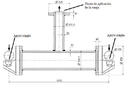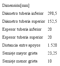 El modelo de estudio considera una unión cilíndrica soldada en T, soportada en sus extremos principales y sometida a una carga P en su extremo libre. Dicha unión posee una grieta semielíptica al pie de la soldadura. Esta grieta ha sido dispuesta de manera que el semieje mayor de la elipse que define la punta de la grieta se encuentre en la superficie exterior del cuerpo principal de la unión, y el semieje menor se encuentre orientado hacia el centro de la tubería, asegurando que el plano de la grieta esté contenido al interior del espesor de la tubería principal (según se muestra en las Figs. 2 y 3). Las dimensiones físicas del modelo, como también de la grieta, corresponden a las utilizadas en estudios realizados sobre diferentes metodologías para la predicción del comportamiento en uniones soldadas [18]-[23], las cuales se resumen en la Tabla 1 y se ilustran en la Fig. 4.