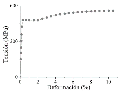 En la simulación numérica se ha utilizado un modelo constitutivo de plasticidad con endurecimiento isotrópico multilineal. La curva de tensión-deformación de la Fig. 5 corresponde a un acero TMCP con un 5% de deformación en frío, cuyo módulo elástico es E = 210 GPa y su módulo de Poisson es v = 0,3 [18].