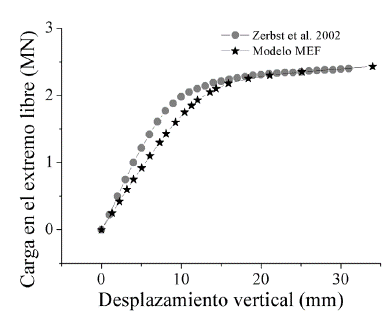 En la Fig. 9 se puede observar cómo los valores obtenidos para la curva de carga-desplazamiento del extremo libre son menores a los disponibles en literatura para la zona de comportamiento lineal. En cuanto a la zona de comportamiento no-lineal del material, con valores de desplazamiento mayores a 15 mm, se tiene que los resultados obtenidos son capaces de ajustar y predecir con precisión el comportamiento de las probetas reales, observándose diferencias cercanas al 12% respecto de los valores experimentales de Zerbst et al. [18].