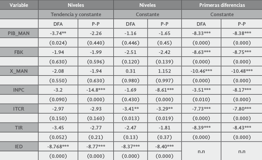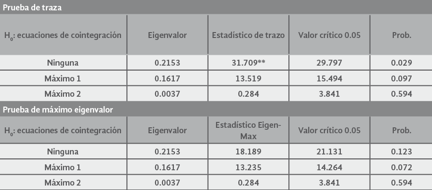 Para conocer la naturaleza estacionaria de las series, primero se realizaron las pruebas de raíz unitaria Dickey Fuller Aumentada (DFA) y la de Phillips-Perron (P-P), que se presentan en el cuadro 3. Como se puede observar, a excepción de la IED, todas las variables son estacionarias en primeras diferencias, lo que implica que es necesario establecer si las tres variables endógenas comparten o no una relación de largo plazo, es decir, si están cointegradas.