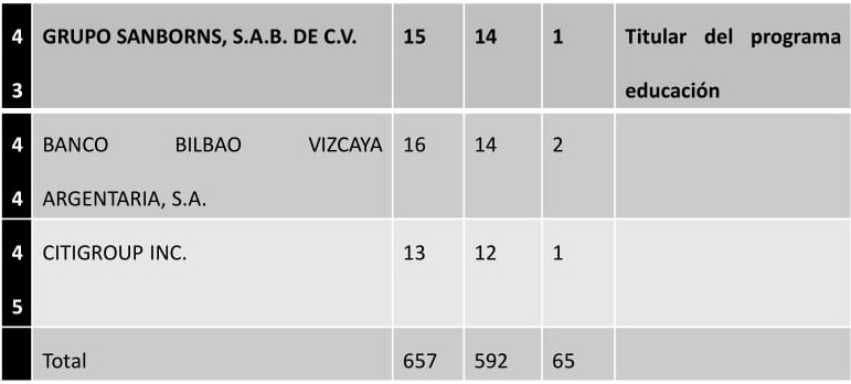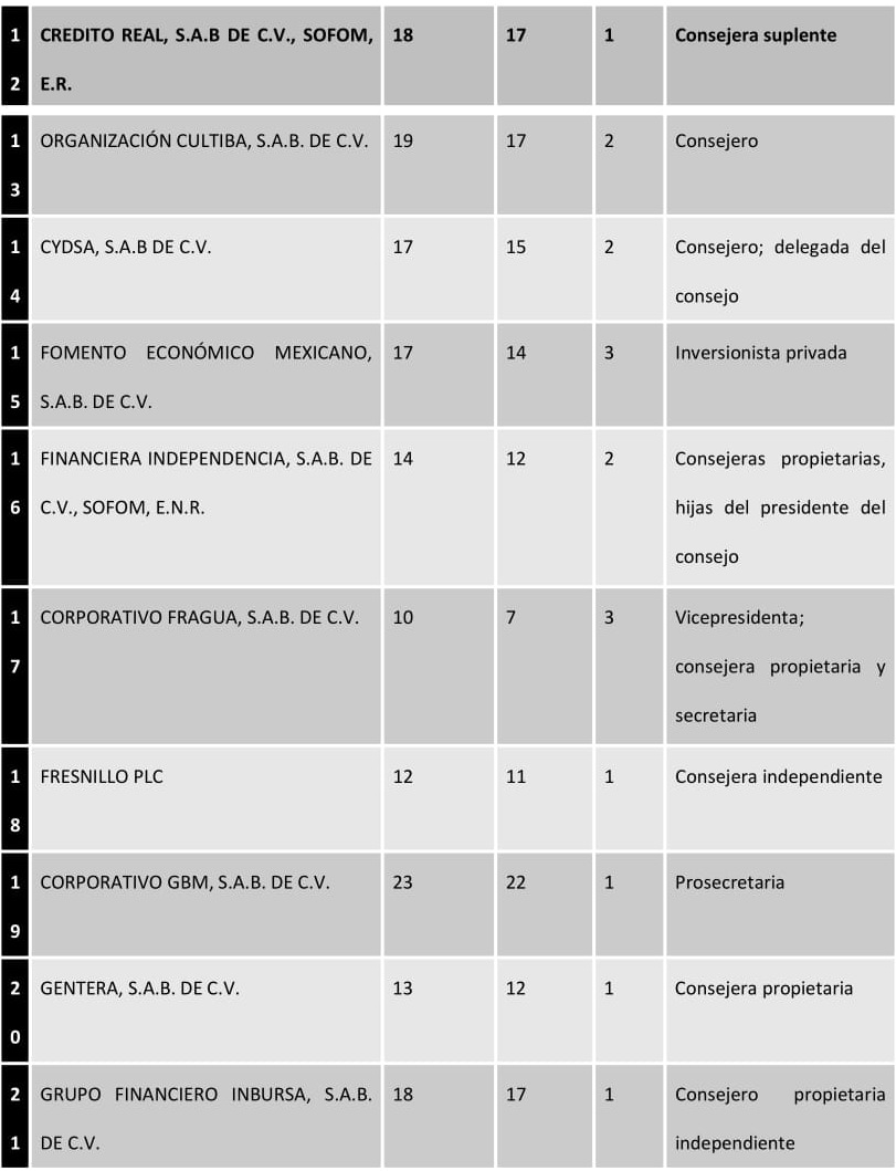 En el Cuadro 3 se observa que en la Financiera Independencia existen dos consejeras propietarias que son hijas del presidente del Consejo. En el Corporativo Fragua participan tres mujeres ocupando los puestos de vicepresidenta, consejera propietaria y secretaria, la empresa está integrada por familia. Por su parte el Grupo Financiero Interacciones cuenta con una mujer como consejera patrimonial, quien es la hija del presidente del consejo; y en el caso de la empresa genomma lab, participa como miembro del consejo la vicepresidenta, quien es la hermana del presidente. La descripción de estas empresas se obtuvo de los informes anuales de los accionistas, quizá existan más casos como estos que no se encuentran señalados en los informes anuales. Teles hallazgos son consistentes con la amplia brecha de género en los ca de Estados Unidos que encontraron Adams y Funk (2012).