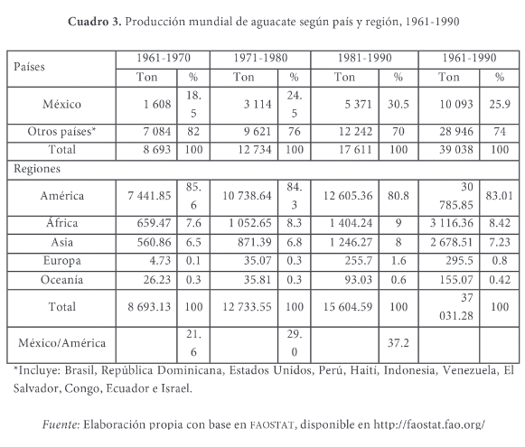 Como producto de esas relaciones, en los años sesenta tanto la producción de aguacate como la superficie sembrada crecieron. En este periodo el cultivo se incrementó a 1 608 toneladas y los productores mexicanos iniciaron la venta de la fruta a varios países como Francia y Alemania. Incluso desde esa década México concentraba 18.5 por ciento de la producción de aguacate a nivel mundial, y el 21.6 por ciento en el continente americano como se muestra en el cuadro 3.