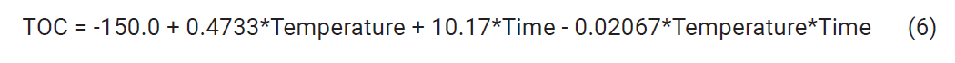 According to the TOC normal plot of standardized effects shown in Fig. 2, factor B (Reaction time) and the interaction AB (Temperature and reaction time) have a significant effect on the response. However, factor A (Temperature) and factor C (oxygen excess) did not have a significant effect. Temperature and oxygen have a positive effect on oxidation re-actions rates, and SCWO studies are usually carried out in a continuous manner with a few seconds of residence time at temperatures higher than 500°C and oxygen excess over 300 % [15], [20]. The lack of a positive effect in both factors could be attributed to the pro-longed reaction time considered in this study, which was long enough, even in the level low, for the oxidation reaction to proceed almost to completion. On the other hand, as expected in any reaction, the interaction between temperature and time means working at higher temperature results in a shorter reaction time. The nature of the interaction for this study is discussed next.