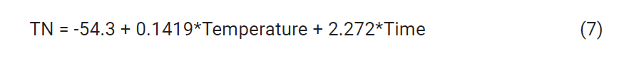 ANOVA for TN destruction efficiency is shown in Table 3, and TN normal plot of standardized effects is presented in Fig. 6. Data standard deviation was 7.18584. The model in Equation (7) had a P-value of 0.000, and an R2 value of 90.23 %, lack of fit was not significant, which means the model fits well the data. Main factors A and B, temperature and time, have a significant effect on nitro-gen abatement, with P-values for temperature and time of 0.001 and 0.000, respectively. Oxidant excess did not have a positive effect, which can be attributed again to the prolonged reaction time. Differently, from what was observed for TOC destruction, there are no significant interactions for TN. Accordingly, the design was re-analyzed dropping the terms C, AC, BC, AB and ABC from the analysis. The results are shown in Figs. 7 and 8. Nor-mal probability plot resembles a straight line, and residuals show a random pattern around 0; therefore, there is no reason to suspect any problems with the validity of the conclusion. TN temperature and time main effects plot is shown in Fig. 9.