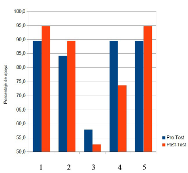 Al participar en la actividad de preparación de una misión espacial, los alumnos dan una elevada importancia a la investigación astronómica (figura 9, 84-90 % de apoyo), aunque parecen dar poca importancia a su financiación, en contraste con el bajo apoyo que recibe el hecho de financiar este tipo de investigación (58 %). Al participar en una discusión socio-científica en relación a la financiación, se producen dos cambios relevantes: aumenta la importancia que se da a la investigación astronómica, y aumenta el apoyo a que cada uno pueda decidir sobre qué financiar (disminuyendo en paralelo el apoyo a uno u otro objetivo a financiar).