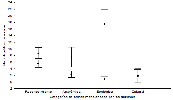 En este análisis fue posible identificar cuántas palabras fueron mencionadas por los alumnos en las cuatro categorías de temas identificados: reconocimiento, anatómica, ecológica y cultural. Cuantitativamente la profundidad fue abordada como la extensión dentro de cada tema. En todas las categorías hubo aumento en el número de palabras después de la visita, excepto en la perspectiva cultural (figura 9).