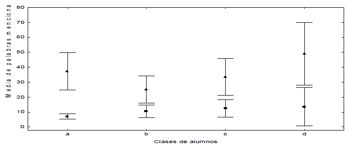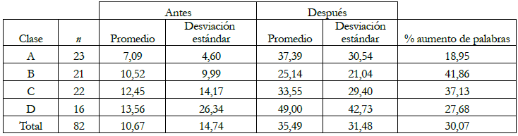 No hubo diferencia significativa en el número de palabras mencionadas entre los alumnos de las cuatro clases tanto en el PPM-Pre (Kruskal-Wallis (3, n=82) H=0,75689, p=0,8597), como en el PMM-Pos (Kruskal-Wallis (3, n=82) H=5,3927, p=0,1452). A partir de estos resultados (figura 3), podemos considerar que antes y después de la visita los alumnos de las cuatro clases tuvieron un comportamiento homogéneo en relación a la cantidad de palabras utilizadas para referirse al eje temático de la exposición. Con este resultado no probamos si hubo diferencia de edad y género. Sin embargo, hubo un aumento significativo del número de palabras en el PMM después de la visita a la exposición. La clase A tuvo un aumento del 10,85 %, la clase B 41,86 %, la clase C 37,13 % y la clase D 27,68 %, con un aumento medio total del 30 % considerando las cuatro clases (tabla 3).