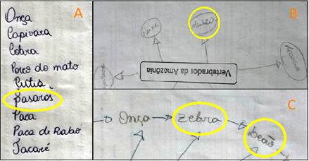El análisis cualitativo de las respuestas de los alumnos antes de la visita permitió identificar un aspecto que puede ser considerado positivo. Los alumnos mencionaron animales vertebrados silvestres nativos de la Amazonía (figura 6A), siendo pocos los casos de alumnos que registraron animales exóticos (figura 6C). Ese aspecto difiere de los resultados de otras investigaciones en grandes centros urbanos (Bermudez et al. 2014, Orozco 2016), donde se destaca el escaso conocimiento de la biodiversidad nativa por parte de niños y jóvenes. Sin embargo, también se identificaron dos elementos que pueden ser considerados problemáticos. El primero se trata de que los alumnos reconocen con más facilidad a los mamíferos, más que a otros grupos de vertebrados (figura 6A). El segundo se refiere a que el conocimiento de la existencia de algunos vertebrados de la Amazonía no garantiza un conocimiento profundo sobre las características anatómicas, ecológicas (figura 7A y 7B) o culturales relacionadas a esos organismos. En algunos casos, los alumnos mencionaron animales que no son vertebrados, como la lombriz (figura 6B).