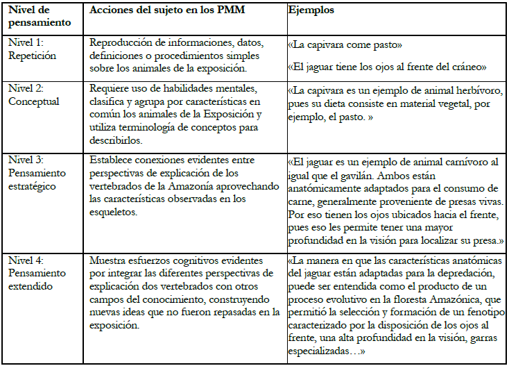 Para la temática «Vertebrados de la Amazonía» y considerando las características de la exposición, se definieron los niveles de pensamiento descritos en la tabla 2.