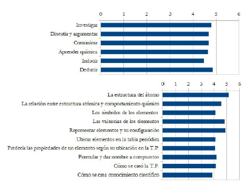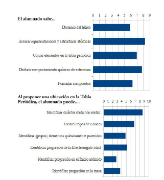 Los resultado de la prueba escrita indican que los alumnos desarrollaron principalmente la capacidad de establecer relaciones entre la estructura atómica de un elemento, su representación y su comportamiento químico (Figura 5). También la capacidad de ubicar elementos en la Tabla Periódica obtuvo un desarrollo importante. En cambio, aspectos como el dominio del léxico o la capacidad de formular compuestos (ambas habilidades que no se hallan en el núcleo del problema a resolver del Estudio de Caso) resultaron en menor desarrollo.