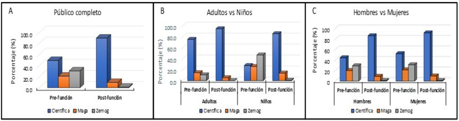 Para comprender mejor estos resultados, en las figuras 4B y 4C se presenta la población segmentada en dos grupos. En cuanto a las edades (figura 4B), se observa que tanto adultos como niños presentan el mismo patrón de cambio de percepción. Ambos grupos migran hacia una identificación correcta de la científica mientras disminuyen los porcentajes atribuidos a los otros dos personajes. Aunque un alto número de adultos identificó correctamente al personaje en la prefunción, lo más notable fue que después de la función, los niños encontraron herramientas de juicio que les permitieron cambiar su opinión hacia una correcta identificación de la científica. En cuanto al género (figura 4C), se observó un patrón de percepción y cambio muy similar.