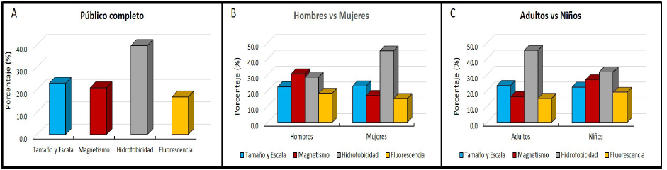 En los resultados por grupos, tres sobresalen: 1) En el análisis por género, las mujeres manifestaron haber comprendido mejor el concepto de hidrofobicidad. Lo mismo fue cierto para los adultos en la clasificación por edades. 2) En los grupos por género y edad, los hombres y niños, respectivamente, presentaron una distribución más homogénea entre los conceptos, a su entender mejor comprendidos. 3) En cualquiera de las tres segmentaciones presentadas, la fluorescencia apareció como el concepto menos seleccionado.