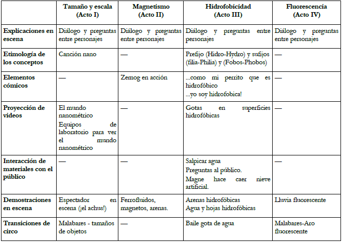 En los actos los personajes interaccionaron con los espectadores, les realizaban preguntas, en ocasiones se les hizo partícipes de las discusiones entre la ciencia y la magia, les salpicaron de agua y nieve artificial, entre otros. Por ejemplo, durante el primer acto para representar/aprender el concepto de Tamaño y Escala, los presentadores invitaban a un espectador y mientras lo saludaban, uno de los presentadores hacía el que estornudaba y cubría la boca con su mano, con la cual saludaba luego al espectador. Entonces la Presentadora mirando con asombro la mano aparentemente sucia del participante exclama: ¡Que nadie se mueva! esta es una excelente oportunidad para mostrarles el mundo “nano”. En seguida entra al escenario otro personaje con un instrumento grande y la presentadora sitúa la mano del espectador en el interior del instrumento. El presentador hace que mira dentro y exclama ¡Woow! ... - En esta parte se apagan las luces para insertar otro tipo de estrategia didáctica: Los vídeos explicativos.