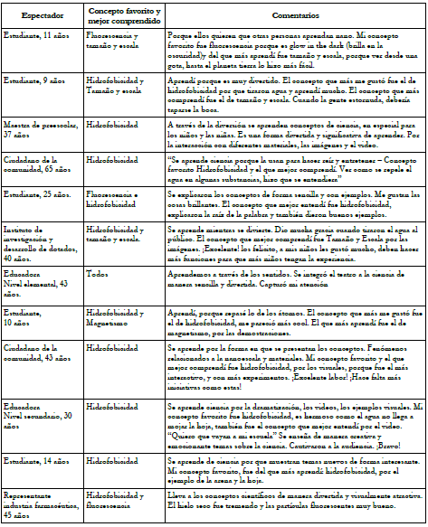 Lo anterior es además reflejado en la parte cualitativa de la evaluación. Cada espectador manifestó elementos particulares útiles para su aprendizaje, estos fueron identificados en las respuestas a las preguntas sobre el concepto favorito y el concepto mejor comprendido (véase la tabla 4).