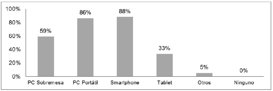Los estudiantes disponían de numerosos aparatos digitales para acceder a la información de la red (Figura 1). Los más habituales (Smartphone y PC Portátil), eran dispositivos que se habían impuesto como herramientas de trabajo y comunicación por su portabilidad y la inmediatez de acceso a la información.