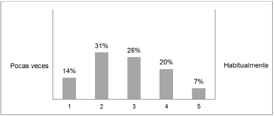 En la primera cuestión, se preguntaba sobre la frecuencia con la que utilizaban Wikipedia, mediante un diferencial semántico de 5 opciones entre «Pocas veces» y «Habitualmente». Los resultados se recogen en la Figura 3.